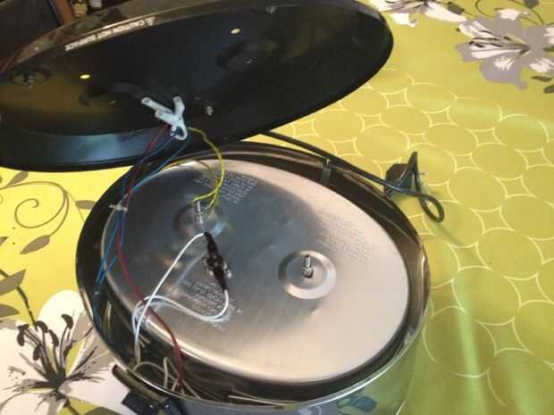 Cada olla será diferente, pero éste tenía dos tuercas en la parte inferior que se desprenden fácilmente. Girar la olla y retirar las dos tuercas. Levante la parte inferior para revelar el interior. Había un cable a tierra al lado y un tornillo que sujeta el mando en su lugar. Eliminar el metal exterior y retire las dos manijas quitando los dos tornillos.