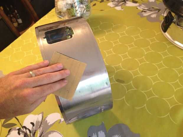 Lave el anillo metálico con agua caliente jabonosa para eliminar ese dip de queso que se ha quedado estancada allí desde 2011. Utilizar la lija de 320 grano para áspero hasta el exterior para que la pintura se pegue a la superficie (al igual queso). El producto terminado debe parecerse 'cepillado acero inoxidable', como nevera que realmente quieres.