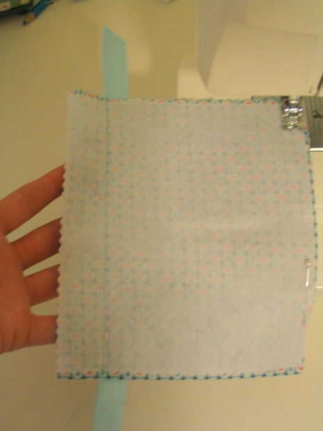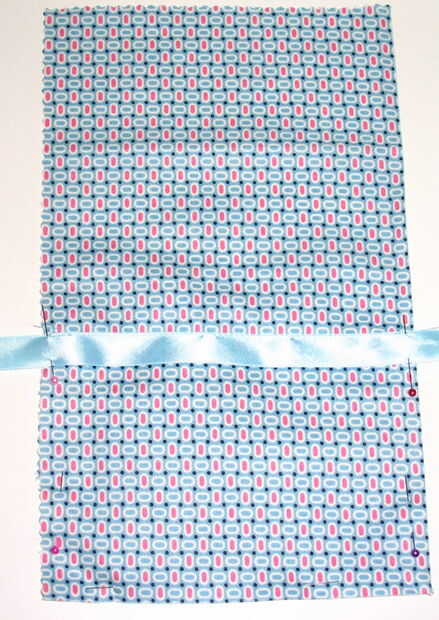 Paso 1: Seleccione una de las piezas de tela del bolsillo (cualquiera de la tres voluntad hacer) y dale la vuelta para que la interfaz está todavía en la parte inferior la mitad. Coloque la cinta a través de la tela, 1" por debajo del punto medio del rectángulo. Dejar algunos que cuelgan sobre cada borde de la cinta. Perno de la cinta en su lugar.