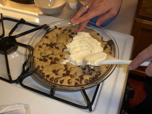 Batir el helado hasta que se obtiene la consistencia suave del servicio. Cubrir el pizookie con el helado de nata, añadir sprinkles y toppings que desee.