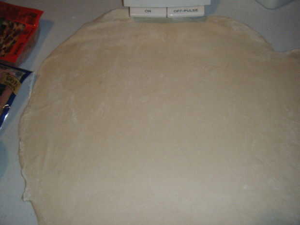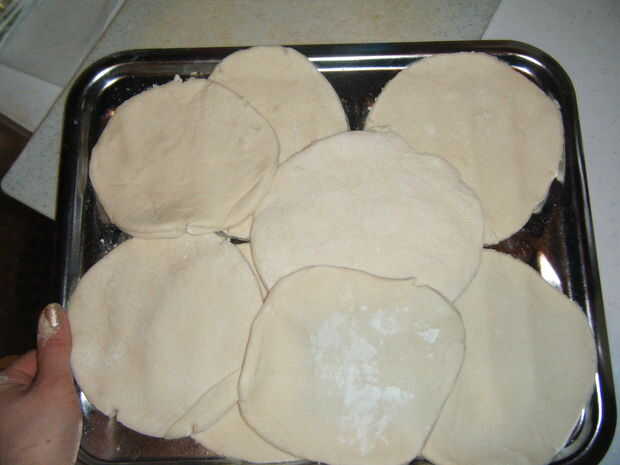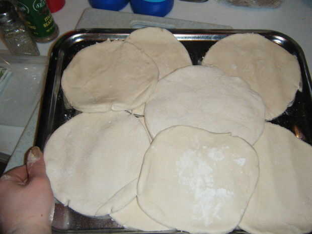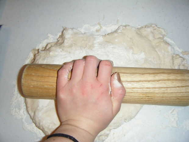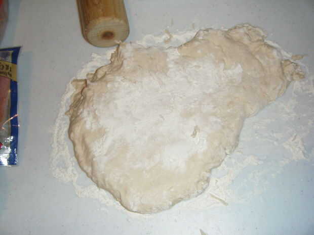 Su superficie (tabla de cortar) la harina ligeramente con harina o harina de maíz y colocar la masa en él. Aplanar como sea posible con las manos y luego estirar con el palote.