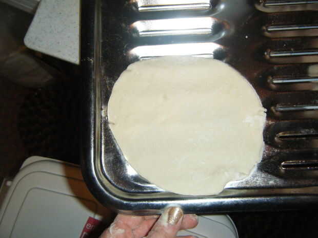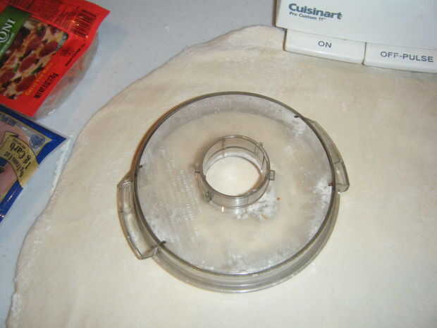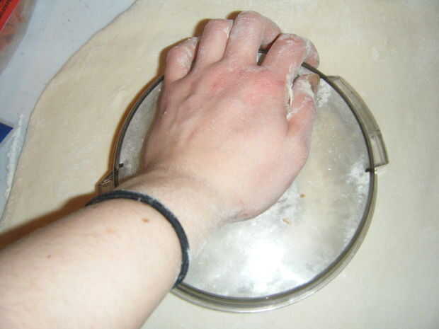 Ahora córtela en la forma adecuada. Mientras que podría hacer esto con un cuchillo, tijeras o incluso las manos, prefiero hacerlo con una tapa redonda agradable consistencia. Recuerde que usted está haciendo esto a la parrilla, por lo que probablemente será más fácil hacer pequeñas pizzas. Si lo haces como yo, colocar su tapa o lo que sea-te-uso en la esquina de su masa enrollada y presione firmemente hacia abajo. Puede que necesite agitan de lado a lado o en un movimiento circular a la masa para dejar ir. Ahora coge su rodaja de masa y colóquela en su recipiente o sobre la mesa. Hacer cuantas más de estas como se necesite. Probablemente se hará una tanda de masa sobre masa para pizza de 6 pulgadas 6-8. Que tenga que hacer más masa.