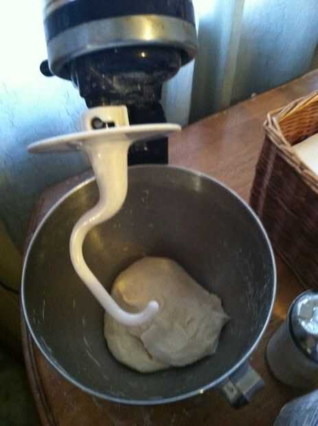 Felicidades! Si estás leyendo esto, tu masa había pasado inspección. Retirar la paleta de la batidora de pan. Reemplace con el gancho. Hacer girar la masa por 1/2 hora. Idealmente, la masa debe aferrarse al gancho sin formar un charco en el tazón de fuente. Si forma un charco, poner dos cucharadas de harina.