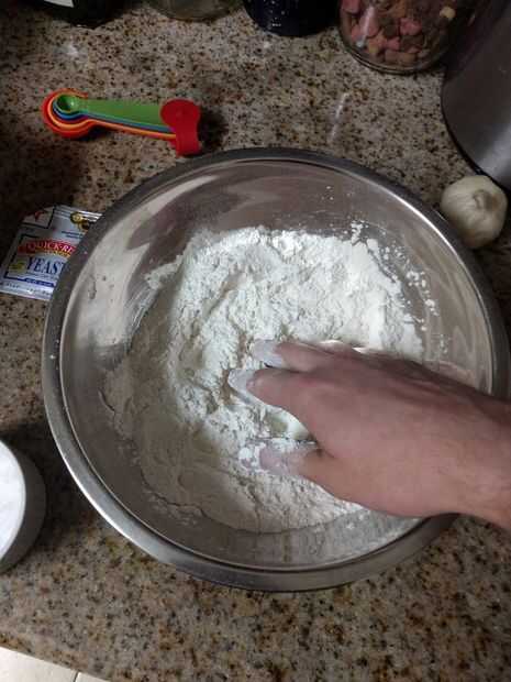 3. Mezcle la levadura y solución de agua con los ingredientes secos hasta que la harina ha sido hidratada y viene juntos para formar una bola abultada. No hay que amasar la masa todavía.