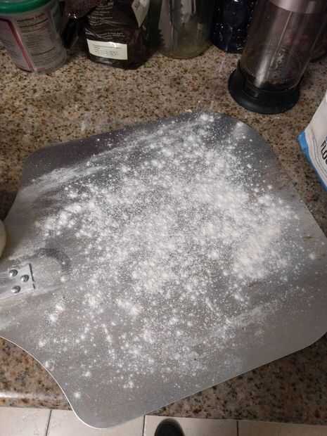 - Coloque la masa extendida sobre la superficie enharinada transferencia. Puede utilizar una bandeja para hornear o tabla de cortar grande para transferir al acero de pizza. Sin embargo, cortezas de pizza están bien de precio para su ventaja.