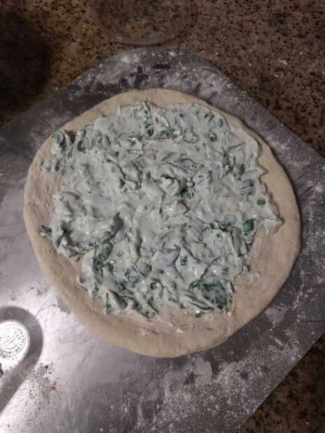 - Esparza la salsa base blanco uniformemente encima de la pizza. Deje una separación de 1" del borde para permitir que la corteza para formar. Si utiliza una placa para horno, puede Agregar los corazones de alcachofa en la parte superior. Si usa una piedra de la pizza o acero, sugiero acodar los corazones de alcachofa después de transferir la pizza al horno. Me parece que es difícil conseguir la pizza para retirarlo de la piel con ingredientes sueltos. Hay una alta posibilidad de que algunos de los corazones de alcachofa se derramará.