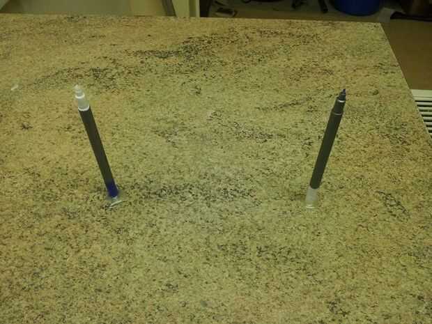 -Encolar dos plumas pistola perpendicularmente a una superficie de cocina. (no te preocupes, el pegamento sale muy fácil desde una superficie lisa!)