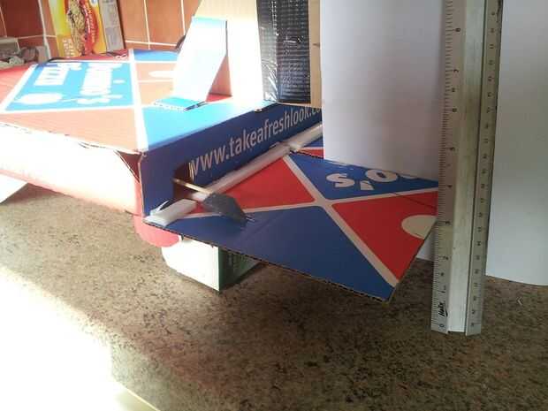 -Ajustar la posición de las baterías y poliestireno hasta que equilibra el plano encima de las plumas.