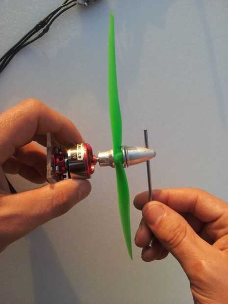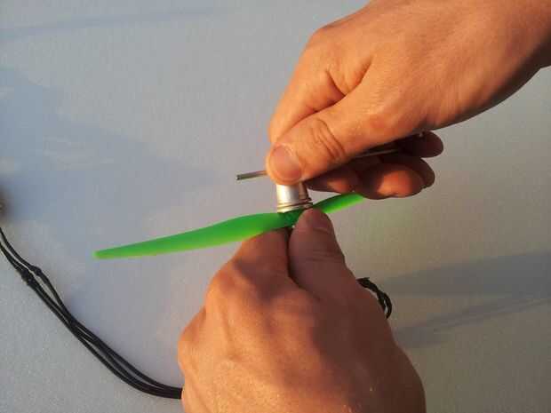 -Coloque la hélice en la parte de varilla roscada de la colet y apriete la tuerca con forma de cúpula con un destornillador hexagonal o destornillador fino