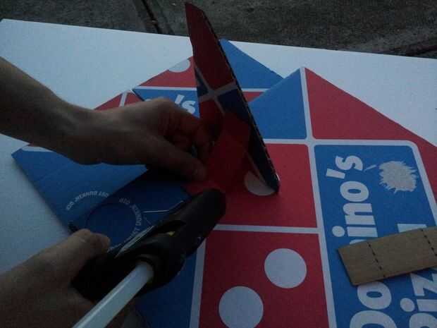 -Una sección de la segunda caja de la pizza se corta para crear el timón. La sección delantera del timón se pega a la parte superior de la caja de pizza utilizando la pistola encoladora.