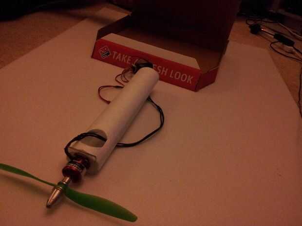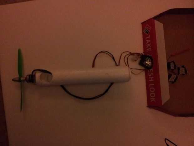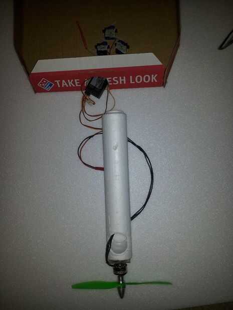 -El propulsor se une al pedacito cuadrado de acrílico con pequeños tornillos. Esto proporciona una mayor superficie para el motor que se adhiere el poliestireno.