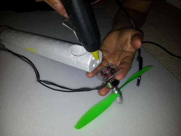 -La pistola de pegamento se utiliza para pegar el conjunto propulsor a la franja de poliestireno.