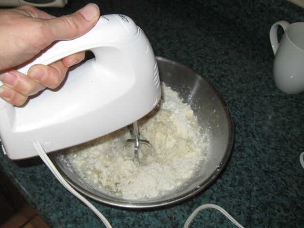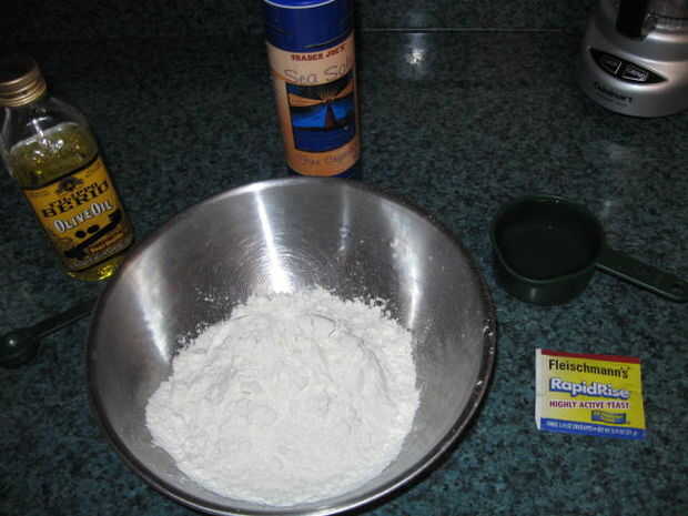 Elementos necesarios: * 3 tazas de harina * 1 bolsa RapidRise Yeast de Fleischmann's * 1/4 cucharadita de sal * 2 cucharadas de aceite de oliva * 1 taza de agua caliente