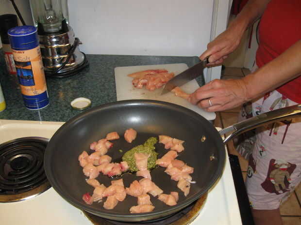 Agregar 1/4 taza de pesto a la cacerola (puede Agregar una cucharada de aceite de oliva si desea). Cortar el pollo en cubos y añadir a la sartén. Sautee' a fuego medio durante 5 minutos, revolviendo constantemente.