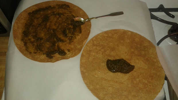 Coloque su número deseado de porciones. Me han encontrado un 8" tortilla o dos tortillas de tamaño más pequeño taco, es sobre el derecho a una porción. Aplique una capa ligera de pesto en cada tortilla. He encontrado que una cuchara de té helado es una gran medida - una cucharada para un tamaño de taco o dos toques para un 8", es casi perfecta. Si usas almacén comprado verduras no desea comenzar con una capa muy gruesa o su tortilla será empapado por el momento que le agregue todo.