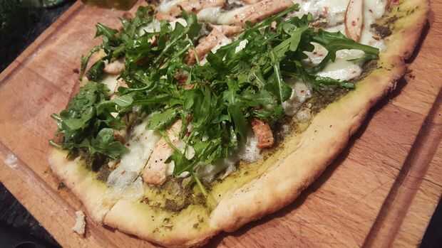 Pizza con Pesto de pollo arty bárbaro.Las combinaciones sin fin que se sientan tan bien en la cima del pan de parmesano Cheezzy. Esta pizza de fusión particular enorgullecería Colón el descubrimiento.Paso 1: ingredientesJuro que eres en Italia en el