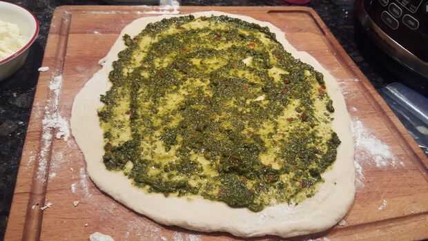 Retirar del horno y agregar el pesto, mozzarella y pollo rebanado. Guardar algunos pesto en el lado para más tarde! Coloque en el horno y cocinar hasta que el queso está burbujeando. Rociar con aceite de oliva durante el tiempo de cocción para crujiente para arriba real bueno.
