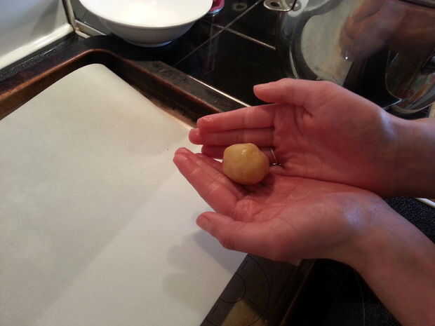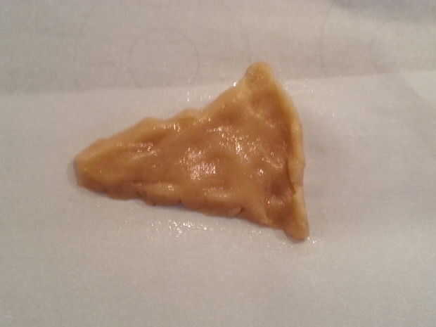 Todos los derechos, que fue bastante fácil, ¿no? Ahora es el momento para formar las rebanadas. Es bastante sencillo. Simplemente rodar una pequeña bola alrededor de una pulgada de diámetro y forma en una rebanada de pizza en una bandeja engrasada. Es un poco lento, pero llegar más rápido a medida que avanza!