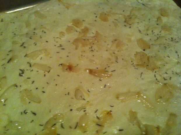 A continuación, tire hacia fuera de cada uno de los dientes de ajo suave y a un lado para enfriar. Luego, estirar la masa de pizza preparada (mina era de alimentos enteros) con las manos o con un rodillo. Una vez que la masa es la forma y espesor quieres, poner en la pizzera y Machaque los dientes de ajo asados en la masa. En tapa está muy bien. Luego, condimentar con lo que tienes en la mano. He utilizado orégano y tomillo.