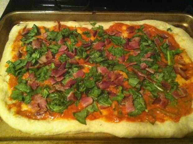 En primer lugar, añadir alrededor de 1/2 taza (o más) de la salsa de pasta de vodka a su pizza. En segundo lugar, añadir el jamón serrano (o tocino cocido) y bolsa de espinacas frescas (aun no parto mina). Por último, es hora de tapa con eso taza de queso.