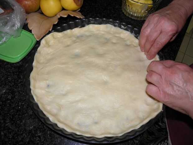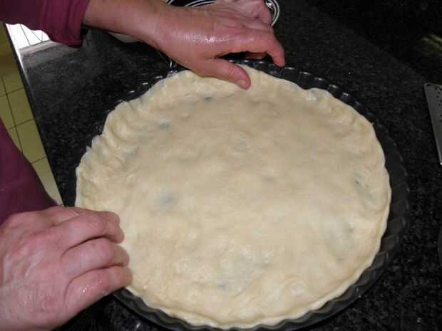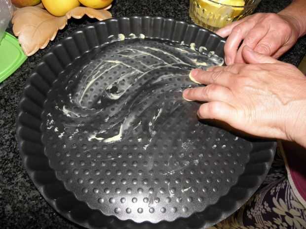 Poner mantequilla en el plato de pizza del horno para que la masa no se atascan a él. Cuando la masa esté lista, estirar sobre el plato (imagen 2 y 3). Doblar los lados de la hacia el interior para formar una corteza de pizza.