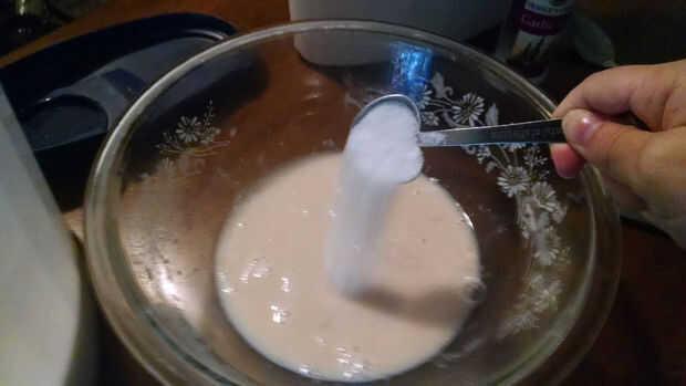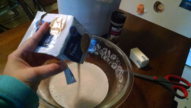 1. Combinar 1 taza de agua tibia con el paquete de la levadura y dejar reposar durante 5 minutos. Revolver.
