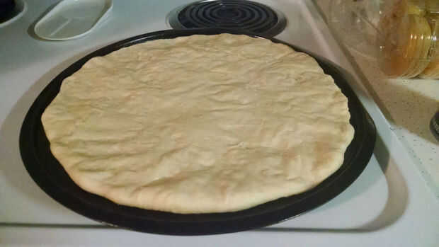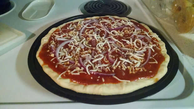 1. Utilizar una salsa de su elección. He encontrado que prefiero salsa de pasta sobre la salsa de pizza y esta noche va a utilizar una salsa para pasta "Zesty y Spicy". Esparcir uniformemente en la masa.