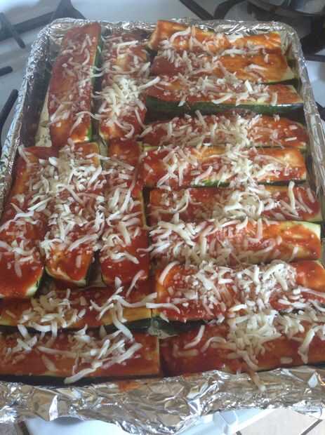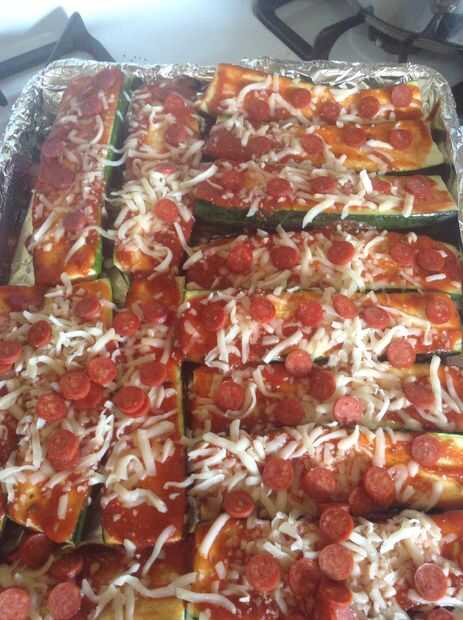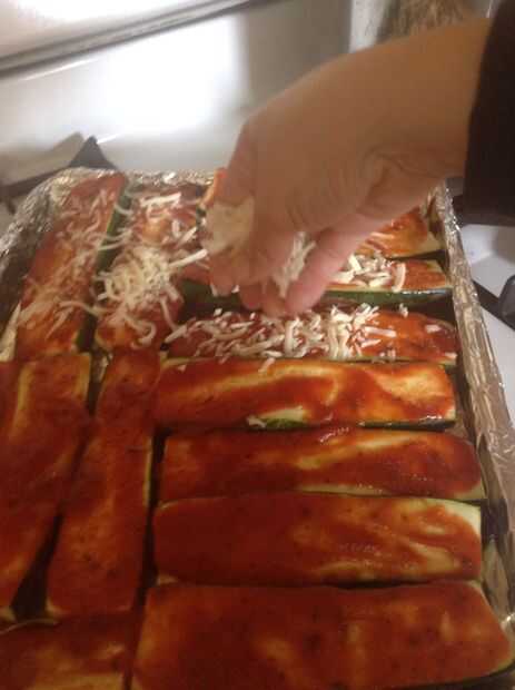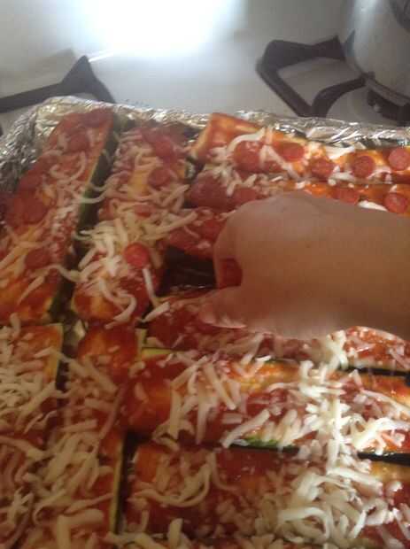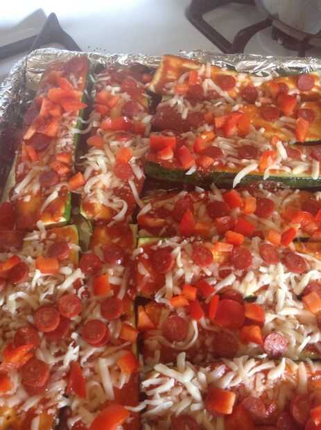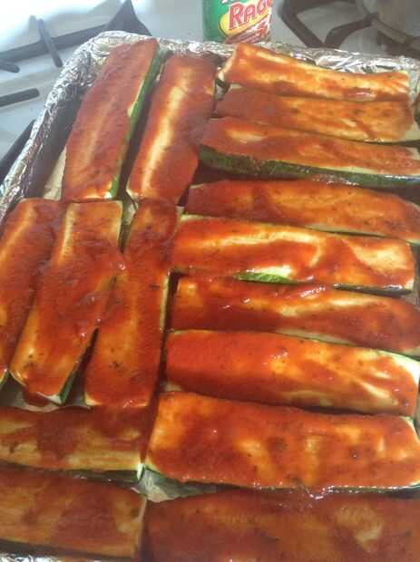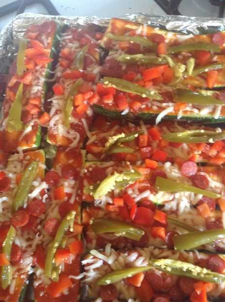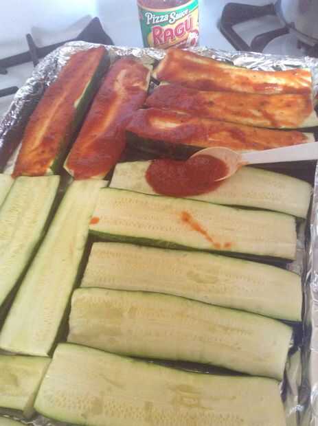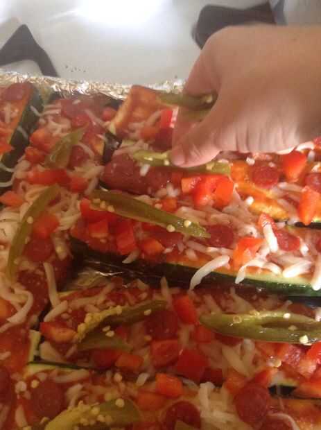 Para los pasos finales, con una cuchara extender salsa de pizza Ragu todo el lado plano de los calabacines. Añadir mozzarella (para una opción más saludable añadir muy poco queso) encima de la salsa ragú. Distribución de 4-5 mini Pipi por calabacín. Coloque el pimiento picado en los calabacines. Por último, agregar 1-2 rodajas de jalapeños.