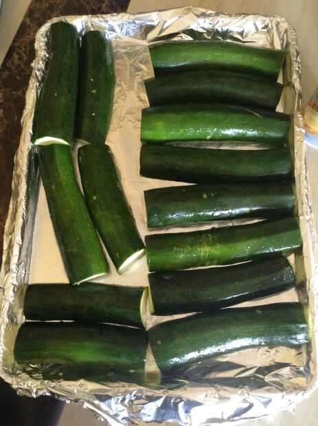 Ponen los calabacines lado plano hacia abajo y Hornee durante 10 minutos.