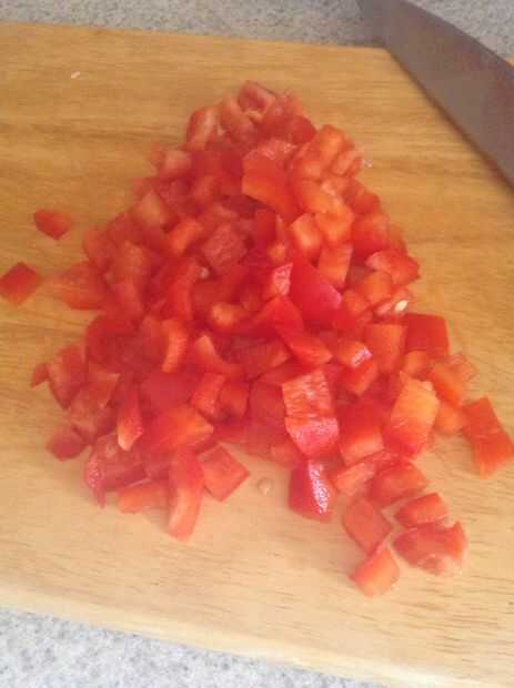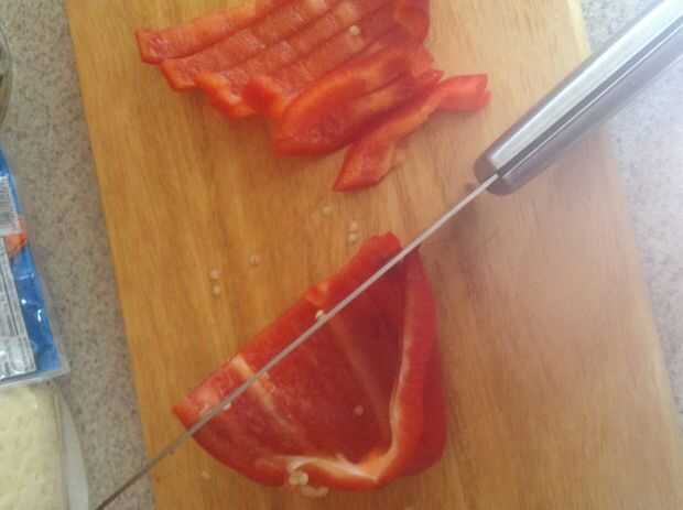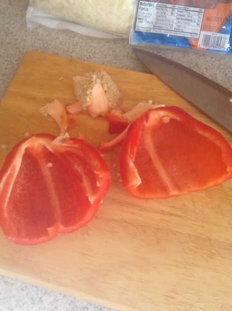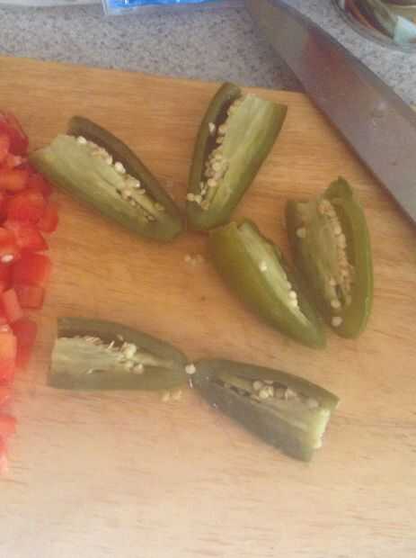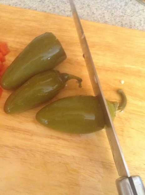 Get all your toppings ready. Dados de corte el pimiento y chiles jalapeños en vinagre mientras se hornean los calabacines durante sus primeros 10 minutos. Quitar las semillas del pimiento y cortar en trozos pequeños. Dependiendo de si gusta la comida picante o no, puede quitar las semillas de chile jalapeño.