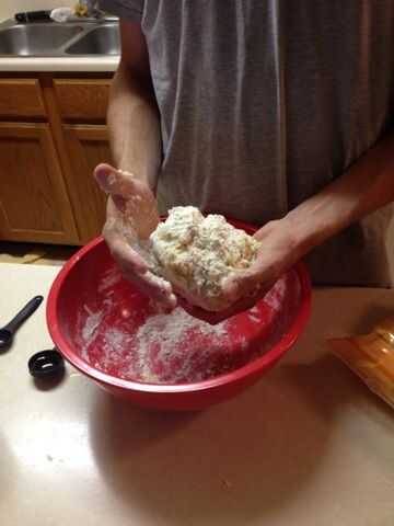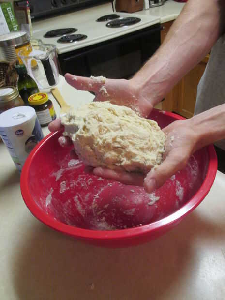Mezclar con las manos durante 5 minutos, añadiendo harina según sea necesario si la corteza es demasiado pegajosa (demasiado mucha harina aunque hará que la corteza sea desmenuzable).