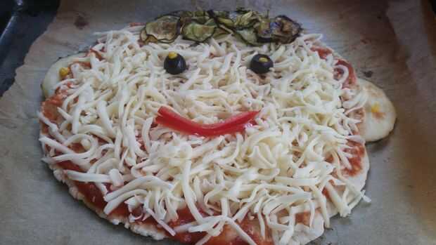 Coloque la pizza preparada en un horno precalentado a 400 grados. Hornear hasta que el queso se derrita y esté dorado en color.