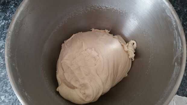 Fije el gancho de amasar a la mezcladora. Encender la batidora y empezar a añadir el agua un poco a la vez. La mezcla aparece grumosa y luego comenzará a salir de los lados del bol. Añadir sal, seguir mezclando hasta que confluye en la forma de una masa suave.