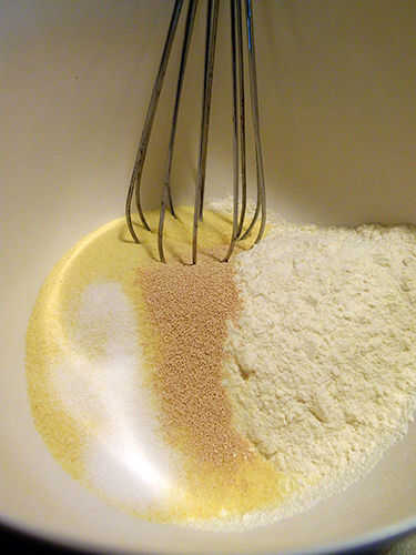 Mezcla blanco junto y harinas de sémola, levadura y sal con un batidor de alambre. Bate en agua y aceite de oliva, con cuchara de madera. Cubrir el tazón con envoltura de plástico y deje la masa reposar a temperatura ambiente durante 30 minutos. Esto permite que la harina absorber agua, que hace más fácil de amasar.