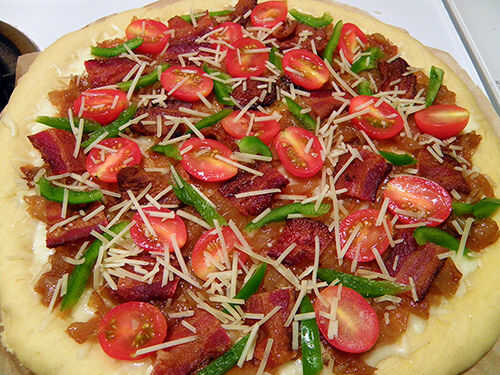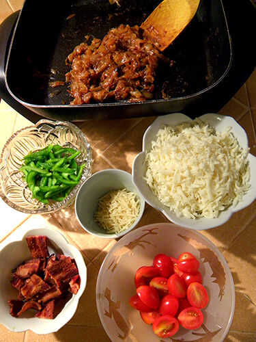 Retire la masa de la pizza del horno y colóquelo en la superficie resistente al calor. Añadir ingredientes en este orden: