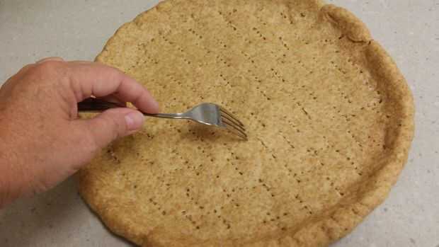 Con un tenedor, haga agujeros en la corteza para evitar que las burbujas durante el proceso de cocción.