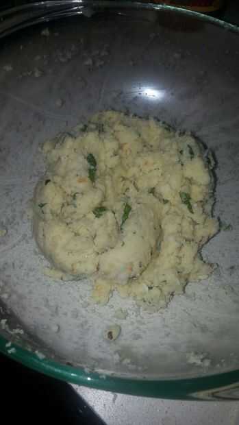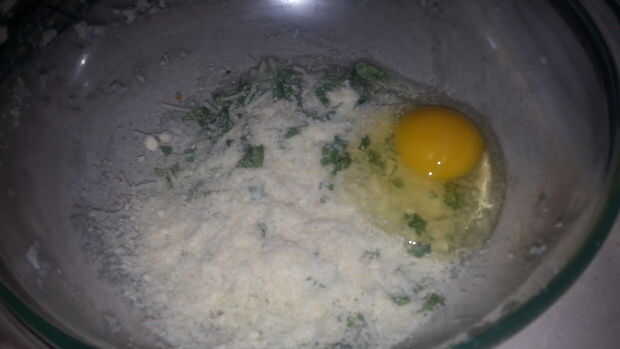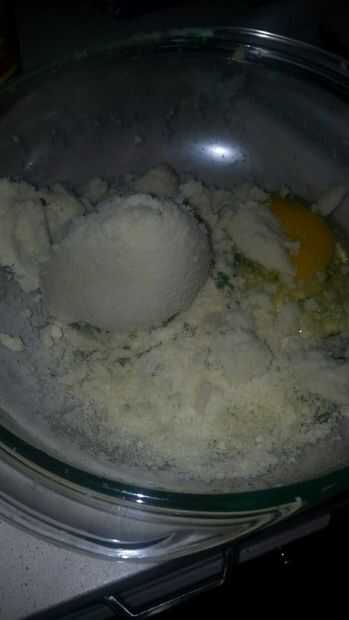 Añadir tus hierbas, hojuelas de pimienta, sal, quesos, huevos y coliflor en una fuente. Mezclar juntos (usando las manos para mezclar es totalmente bien) Cuando se combina, gey listo para rodar