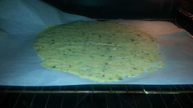 Deposite un pedazo grande de papel de pergamino y poner aceite de oliva en ella (o cualquier aceite) Frote el aceite de oliva en el papel y proceder a estirar (no demasiado gruesa) He utilizado anothet hoja de pergamino en la parte superior para no pegarse al rodillo, pero también se puede presionar con las manos