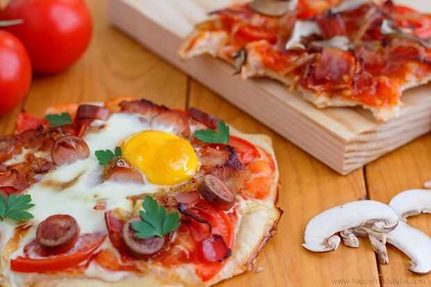 opciones de pizza de desayuno son ilimitadas. He hecho 2 de las combinaciones disponibles:queso crema, huevos, queso cheddar y tocinosalsa, huevos, queso cheddar, cebolla y salchichaPero podrias ponerlo que quieras en él. Nada puede poner en un sándw