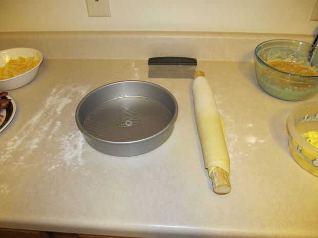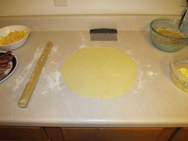 Una vez que la masa se enrolla, tratarla como una tarta y enróllelo alrededor del perno de balanceo de... o clavija de madera.