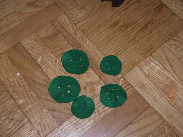 -Encurtidos: Cortar algunos verde fieltro círculos, hacer un pequeño agujero en el centro de cada una un más pequeños agujeros alrededor de él (al igual que real encurtidos).