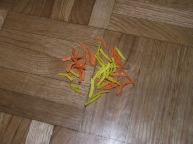 -Queso: Cortar pequeñas tiras de fieltro amarillo y naranja.