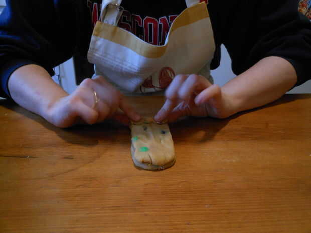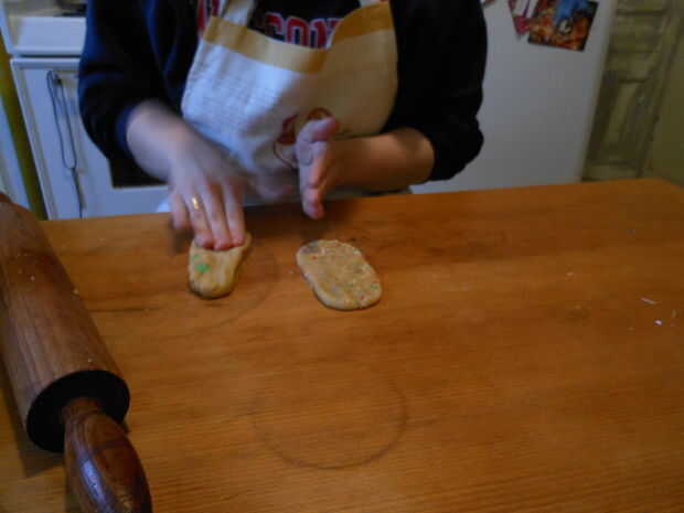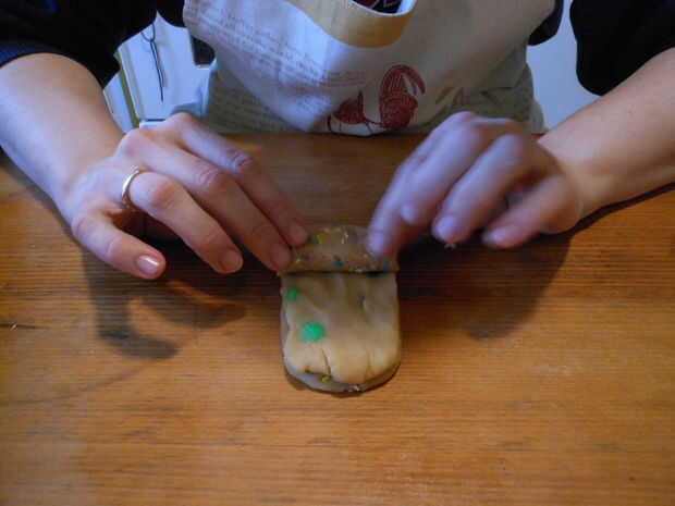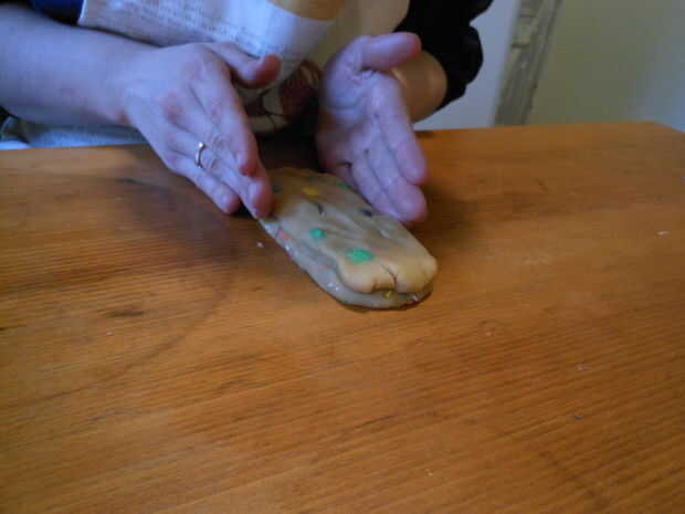 1. aplanar las dos piezas de diferentes sabores de masa hasta aproximadamente un 1/4 pulgada gruesa. Asegúrese de que son similares en tamaño.