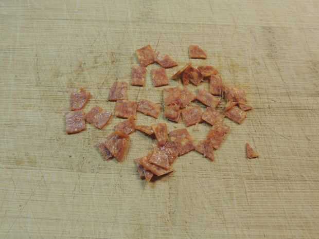 Si su elección con pepperoni, vas a querer cortar en pedazos. También puede cortar a pedacitos de salchicha, o de otras verduras cocidas como usted desea.