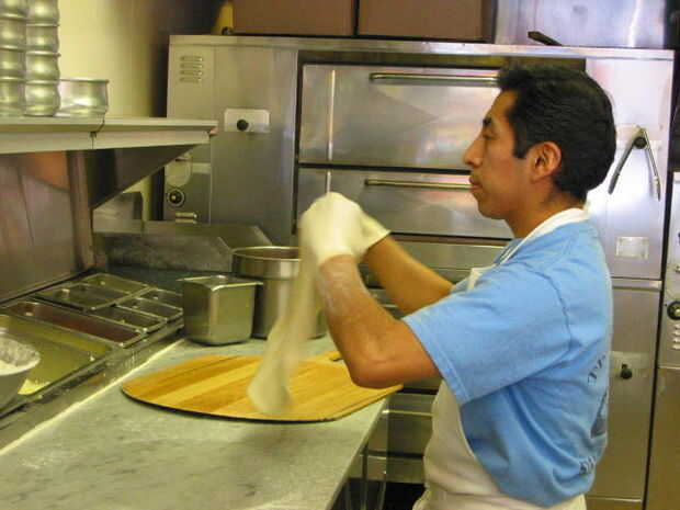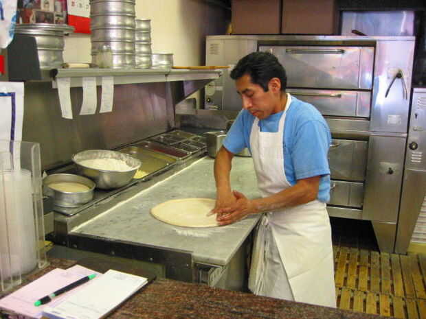 He incluido unas cuantas fotos de la pizza a continuación del proceso de fabricación. Creo que algunos de los factores clave en la fabricación de grandes sectores de Nueva York son: