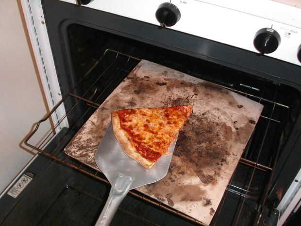 2. tengo una piedra de pizza que hizo por el despliegue de un gran terrón de arcilla en una prensa - por lo utilizo en cualquier momento estoy cocinar pizza - fresca o recalentados. Su bastante pesado y no un buen trabajo de la transferencia de calor a la parte inferior de la pizza. Usted puede salir y conseguir una piedra de pizza, o puede utilizar una piedra verdadera, o incluso un azulejo de la terracota grande si sólo quiere pasar unos pocos dólares. Permita que la piedra se agradable y caliente antes de poner en la pizza.