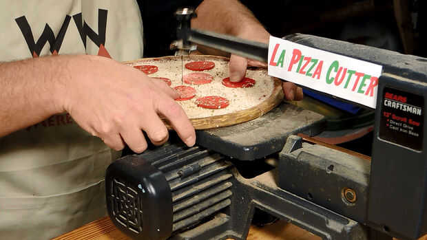 Un cortador de pizza regular no funcionará para esta pizza madera. Use una sierra caladora, jigsaw o sierra de cinta para cortar la pizza en rebanadas. Corté solo una rebanada de mi pizza. Si usted está haciendo un reloj de pared de pizza, no puede cortar la pizza.