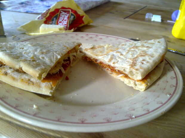 Colocar una pieza encima del otro, queso y otros contenidos en el medio