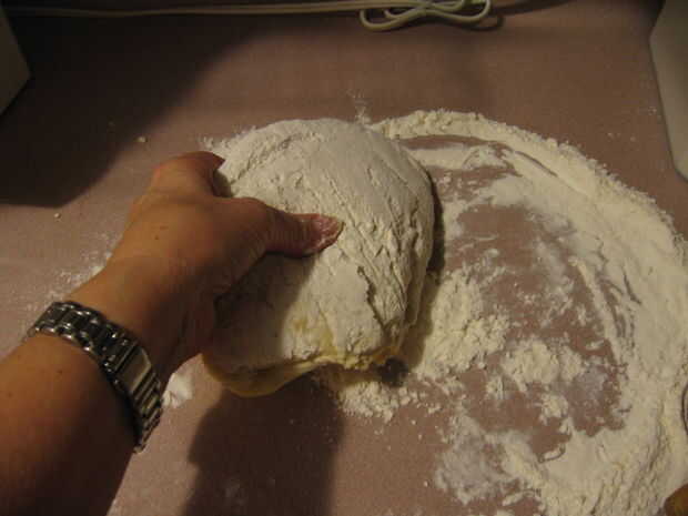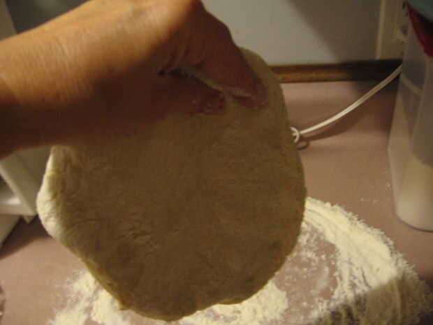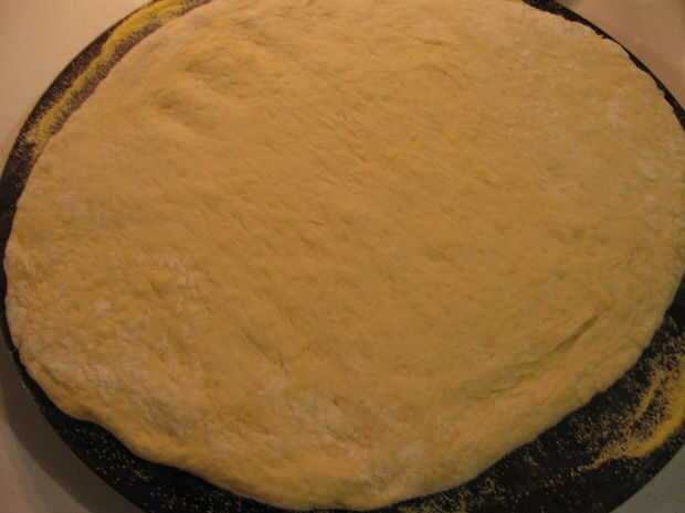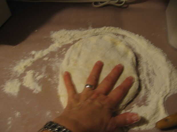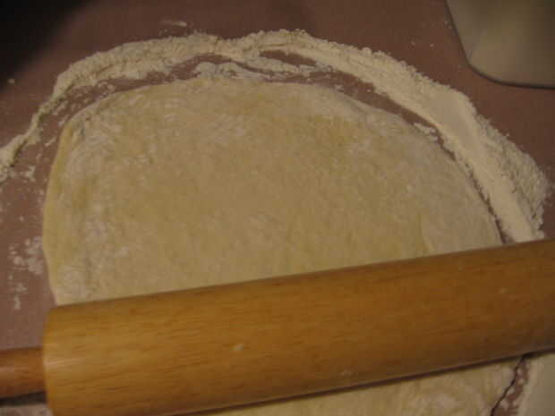 Coloque la primera mitad de la masa sobre la superficie enharinada y presione en un círculo con las manos. Una vez que tienes un círculo de Levante y la masa se extienden en longitud, coloque en una superficie enharinada y estirar la masa al tamaño deseado (rodillo).