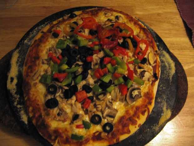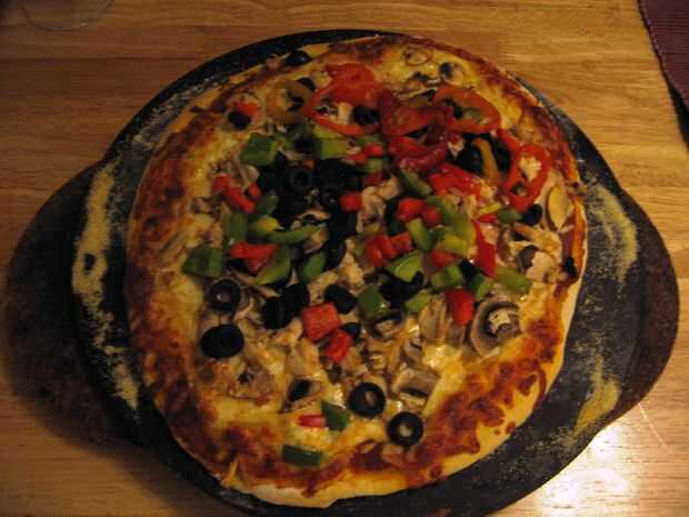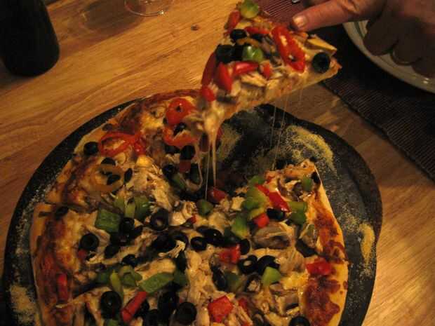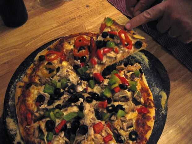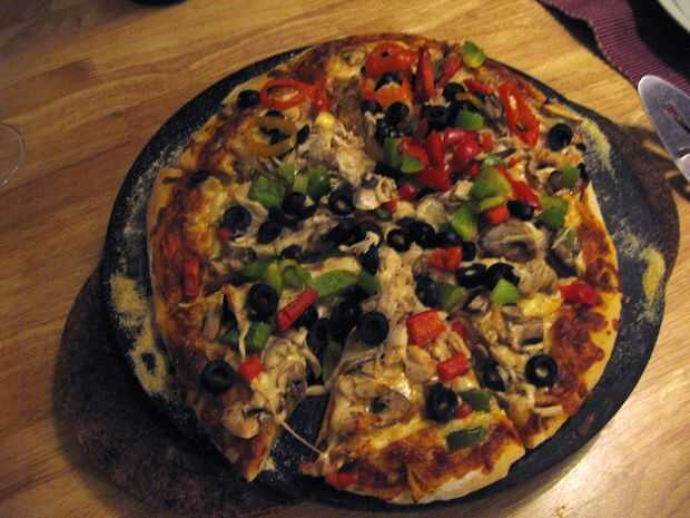 Mientras alguien está terminando la última pieza, limpie la piedra para pizza y ponerlo en el horno durante 5 minutos para calentarlo. Estirar la segunda mitad de la masa y hacer la pizza igual a la primera.